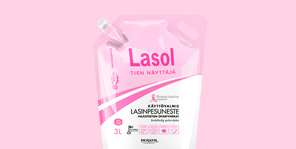 Käyttövalmis Lasol on saatavilla nyt rajoitetun ajan Roosa nauha -kampanja-asussa K-Citymarketeissa ja Motonet-myymälöissä kautta maan. Jokaisesta pussista lahjoitetaan 0,40 € Roosa nauha -keräykseen.